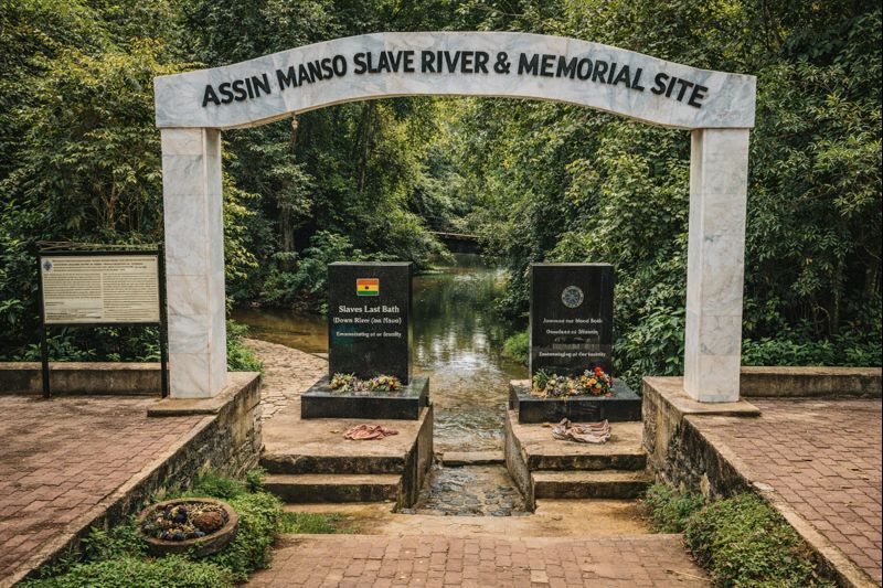 This morning, we journey south toward Cape Coast with a powerful stop at the Assin Manso Slave River & Memorial Site. This is where enslaved Africans took their “last bath” before being marched to the coast.